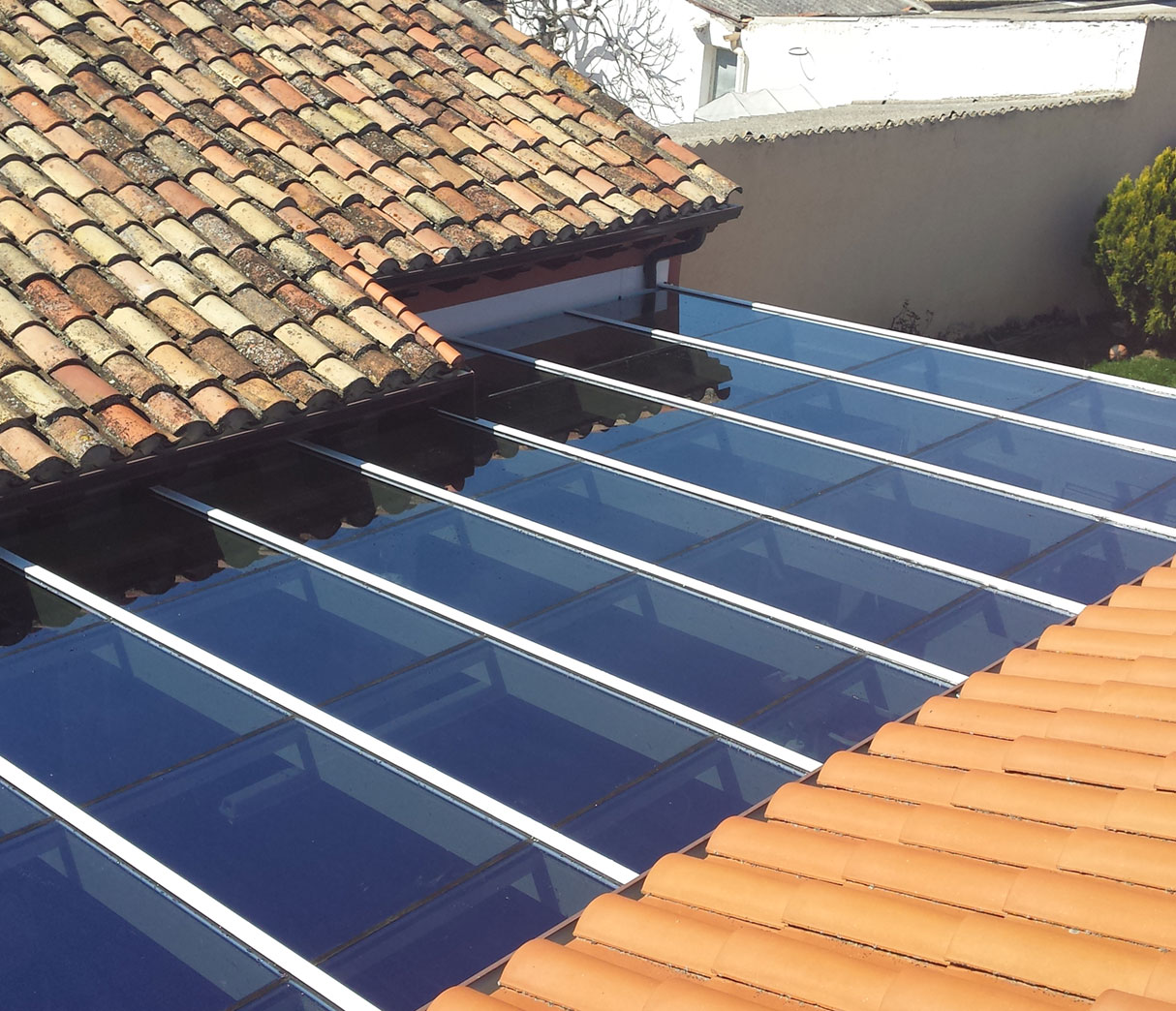 - Laminar de seguridad con bajo emisivo: con ello conseguimos mejorar la eficiencia energética del techo, y en caso de rotura, que el vidrio se mantenga en una sola pieza, pegado por la lámina que los une.